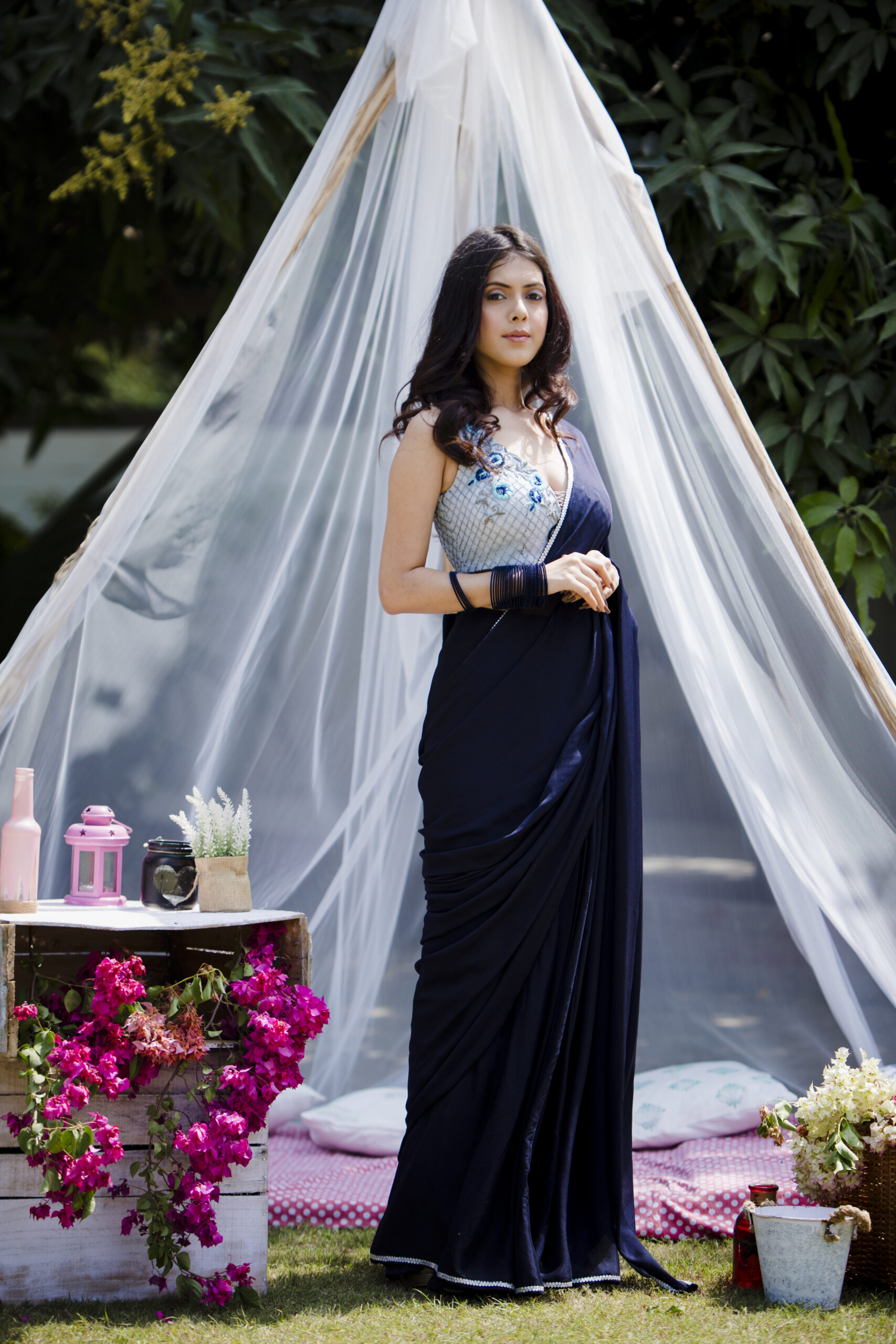 Blue chinnon chiffon saree paired with heavy hand embroidered blouse adorned with shimmering sequin and Kat dana making it an ethereal beauty.